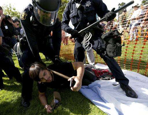 A pro-Donald Trump supporter is taken into custody by police during competing demonstrations at Martin Luther King Jr. Civic Center Park in Berkeley, Calif., Saturday, April 15, 2017. Protesters took to the streets in dozens of cities nationwide, many calling on Trump to release his tax returns. (Anda Chu/San Jose Mercury News via AP)