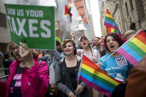 Demonstrators carrying rainbow flags participate in a rally to demand President Donald Trump release his tax returns, Saturday, April 15, 2017, in New York. Protesters took to the streets in dozens of cities nationwide Saturday to call on Trump to release his tax returns, saying Americans deserve to know about his business ties and potential conflicts of interest. (AP Photo/Mary Altaffer)