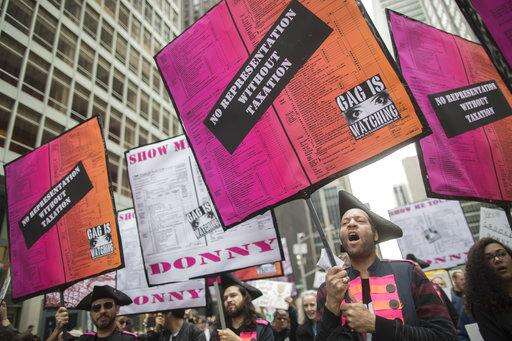 Demonstrators participate in a march and rally to demand President Donald Trump release his tax returns, Saturday, April 15, 2017, in New York. Protesters took to the streets in dozens of cities nationwide Saturday to call on President Donald Trump to release his tax returns, saying Americans deserve to know about his business ties and potential conflicts of interest. (AP Photo/Mary Altaffer)