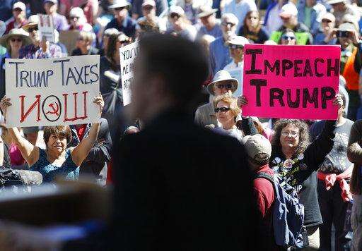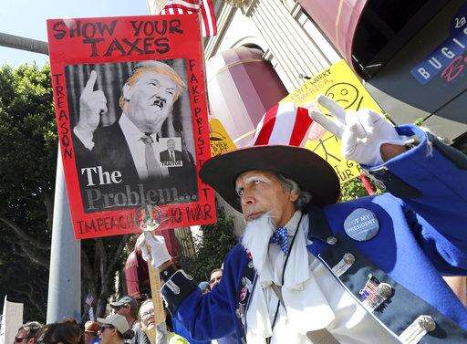 Demonstrators protest President Donald Trump's failure to release his tax returns and a host of other issues during a march and rally in downtown Los Angeles Saturday, April 15, 2017. (AP Photo/Reed Saxon)