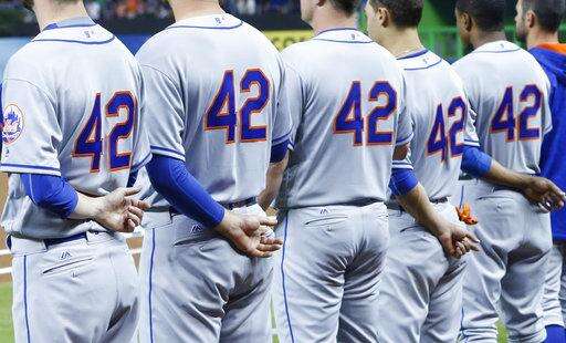New York Mets players, all wearing No. 42, stand during the singing of the national anthem before a baseball game against the Miami Marlins, Saturday, April 15, 2017, in Miami. Every Major League player wore No. 42 on Saturday to honor Jackie Robinson. (AP Photo/Wilfredo Lee) The Associated Press