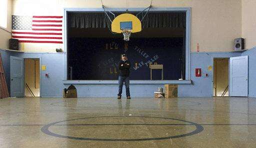In this April 5, 2017 photo, Garrett Zoller, principal broker with LandandWildlife.com, stands under a basketball hoop in the abandoned gym of Tiller Elementary School in Tiller, Ore. Zoller is working to sell almost all of the downtown of the tiny, dying timber town for a total of $3.85 million. A potential buyer has come forward but is remaining anonymous -- and back-up offers are still being accepted. (AP Photo/Gillian Flaccus) The Associated Press