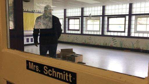 In this April 5, 2017 photo, Garrett Zoller, principal broker with LandandWildlife.com, walks in a classroom inside the abandoned Tiller Elementary School in Tiller, Ore. Zoller is working to sell almost all of the downtown of the tiny, dying timber town for a total of $3.85 million. A potential buyer has come forward but is remaining anonymous -- and back-up offers are still being accepted. (AP Photo/Gillian Flaccus) The Associated Press