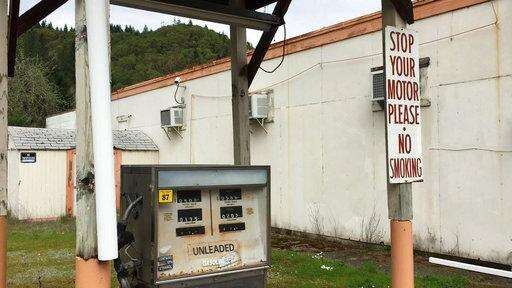 In this April 5, 2017 image made from video, a gas pump stands abandoned, the price frozen in time, in downtown Tiller, Ore. Tiller, a dot on a map in remote southwestern Oregon, is for sale for $3.5 million, including the gas station, and the elementary school is for sale separately for $350,000. (AP Photo/Gillian Flaccus) The Associated Press