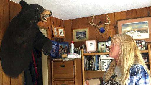 In this April 5, 2017 photo, longtime resident Paula Ellis shows off a bear head hanging on the wall in her home in Tiller, Ore. Ellis spent her childhood in Tiller hunting and riding horses and now worries about what will happen to the tiny, dying timber town. Tiller, a dot on a map in remote southwestern Oregon, is for sale for $3.5 million and the elementary school is for sale separately for $350,000. (AP Photo/Gillian Flaccus) The Associated Press