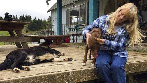 In this April 5, 2017 photo, longtime resident Paula Ellis plays with her dogs outside her home in Tiller, Ore. Ellis spent her childhood in Tiller hunting and riding horses and now worries about what will happen to the tiny, dying timber town. Tiller, a dot on a map in remote southwestern Oregon, is for sale for $3.5 million and the elementary school is for sale separately for $350,000. (AP Photo/Gillian Flaccus) The Associated Press