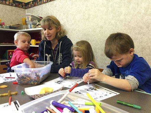 In this April 5, 2017 photo, resident Sarah Crume holds her daughter, Hallie, as siblings Patricia and Thomas Doolittle color nearby at the local church in Tiller, Ore. The church is one of the few buildings in downtown Tiller that is not for sale. Almost all of the downtown in Tiller, a dot on a map in remote southwestern Oregon, is for sale for $3.5 million and the elementary school is for sale separately for $350,000. (AP Photo/Gillian Flaccus) The Associated Press