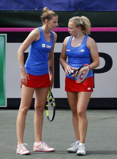 Czech Republic's Kristyna Pliskova, left, talks with teammate Katerina Siniakova before he turn to serve to United States players, CoCo Vandeweghe and Bethanie Mattek-Sands during a Fed Cup semifinal doubles tennis match, Sunday, April 23, 2017, in Wesley Chapel, Fla. (AP Photo/John Raoux)
