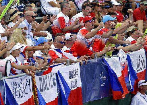Czech Republic fans cheer during a Fed Cup semifinal doubles tennis match between Czech Republic's Kristyna Pliskova, and Katerina Siniakova against the United States team, CoCo Vandeweghe and Bethanie Mattek-Sands, Sunday, April 23, 2017, in Wesley Chapel, Fla. (AP Photo/John Raoux)