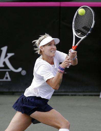 United States' Bethanie Mattek-Sands playing with partner CoCo Vandeweghe returns a shot to Czech Republic players Kristyna Pliskova and Katerina Siniakova during a Fed Cup semifinal doubles tennis match, Sunday, April 23, 2017, in Wesley Chapel, Fla. (AP Photo/John Raoux)