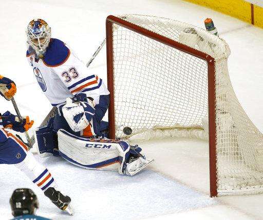 Edmonton Oilers goalie Cam Talbot (33) looks back as a puck hits the post on a shot at goal by a San Jose Sharks during the third period in Game 6 of a first-round NHL hockey playoff series Saturday, April 22, 2017, in San Jose, Calif. The Oilers won 3-1. (AP Photo/Tony Avelar) The Associated Press