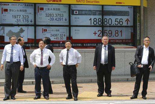 ASIA'S DAY: Japan's benchmark Nikkei 225 rose 1.4 percent to finish at 18,875.88. Australia's S&P/ASX 200 gained 0.3 percent to 5,871.80. South Korea's Kospi added 0.4 percent to 2,173.74. Hong Kong's Hang Seng added 0.5 percent to 24,164.24.