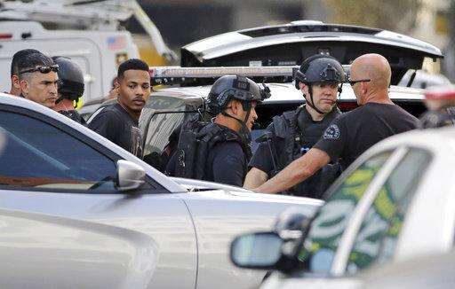 Los Angeles SWAT officers take a man, second from left, into custody after an hours-long search of a building in Los Angeles' downtown Garment District, Monday, April 24, 2017. Police say they were called to the corner of 8th and Santee Streets shortly before noon, when officers responded to a call about gunshots fired in the area. The man was tracked to a nearby building, triggering a room-by-room search of the entire structure before he called police and surrendered without incident. (AP Photo/Reed Saxon)