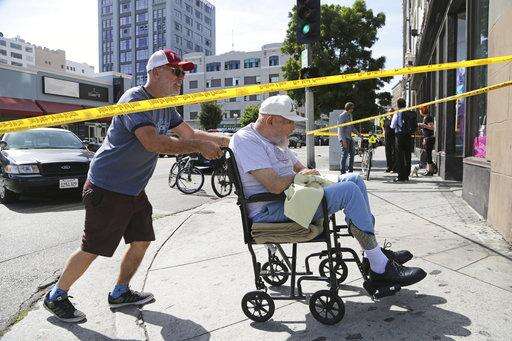 People navigate a barricade as Los Angeles police officers search a building at left rear in Los Angeles' downtown Garment District, Monday, April 24, 2017. Police converged on a downtown Los Angeles apartment building Monday afternoon as they searched for a man who they believe shot at a passing motorist before running inside the building. (AP Photo/Reed Saxon)