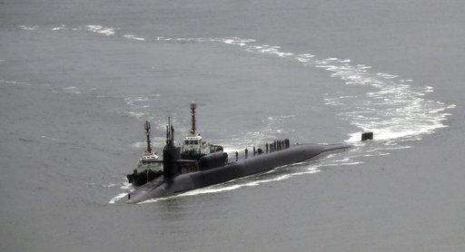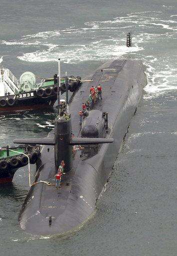 The nuclear-powered submarine USS Michigan approaches to join the U.S. aircraft carrier USS Carl Vinson in drills near the Korean Peninsula, at Busan port in Busan, South Korea, Tuesday, April 25, 2017. North Korea marks the founding anniversary of its military on Tuesday, and South Korea and its allies are bracing for the possibility that it could conduct another nuclear test or launch an intercontinental ballistic missile for the first time. (Jo Jung-ho/Yonhap via AP)