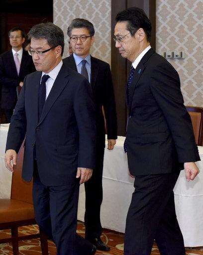 Chief nuclear negotiators, Joseph Yun, U.S. special representative for North Korea policy, left, Kenji Kanasugi, director general of the Japanese Foreign Ministry's Asian and Oceanian Affairs Bureau, right, and Kim Hong-kyun, special representative for Korean Peninsula peace and security affairs at the South Korean Foreign Ministry, rear, arrive fir their meeting about North Korean issues at the Iikura Guesthouse in Tokyo Tuesday, April 25, 2017. North Korea marks the founding anniversary of its military on Tuesday, and South Korea and its allies are bracing for the possibility that it could conduct another nuclear test or launch an intercontinental ballistic missile for the first time. (Toru Yamanaka/Pool Photo via AP)