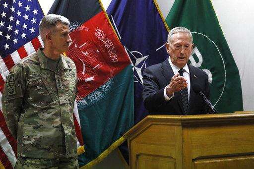U.S. Defense Secretary James Mattis , right, and U.S. Army General John Nicholson, left, commander of U.S. Forces Afghanistan, hold a news conference at Resolute Support headquarters in Kabul, Afghanistan, Monday, April 24, 2017. Mattis arrived unannounced in Afghanistan to assess America's longest war as the Trump administration weighs sending more U.S. troops. (Jonathan Ernst/Pool Photo via AP) The Associated Press