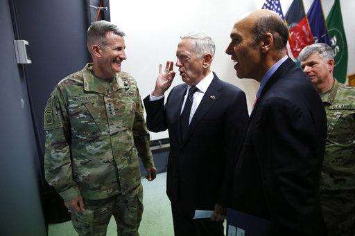 U.S. Defense Secretary James Mattis, center, chats with U.S. Army General John Nicholson, left, commander of U.S. Forces Afghanistan, after a news conference at Resolute Support headquarters in Kabul, Afghanistan, Monday, April 24, 2017. Mattis arrived unannounced in Afghanistan to assess America's longest war as the Trump administration weighs sending more U.S. troops. (Jonathan Ernst/Pool Photo via AP) The Associated Press