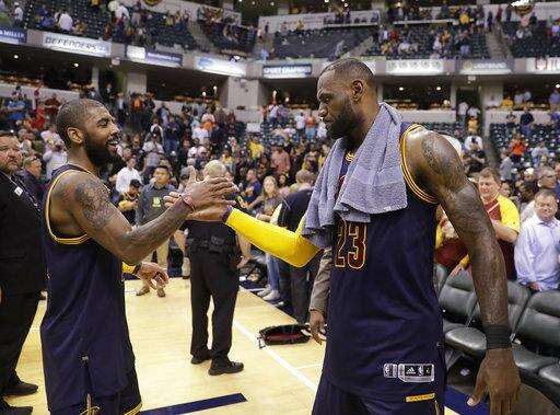 Cleveland Cavaliers' LeBron James, right, and Kyrie Irving celebrate after Cleveland defeated the Indiana Pacers 106-102 to win Game 4 of a first-round NBA basketball playoff series, Sunday, April 23, 2017, in Indianapolis. Cleveland won the series 4-0. (AP Photo/Darron Cummings) The Associated Press