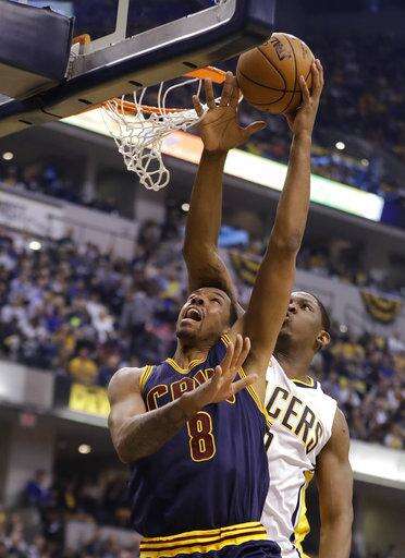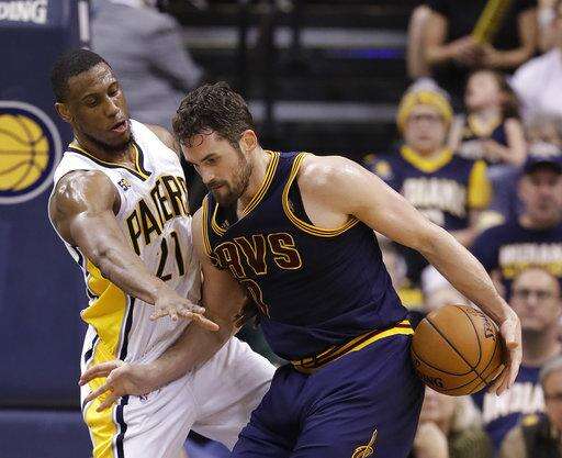 Cleveland Cavaliers' Kevin Love is defended by Indiana Pacers' Thaddeus Young during the second half in Game 4 of a first-round NBA basketball playoff series, Sunday, April 23, 2017, in Indianapolis. Cleveland defeated Indiana 106-102 and won the series 4-0. (AP Photo/Darron Cummings) The Associated Press