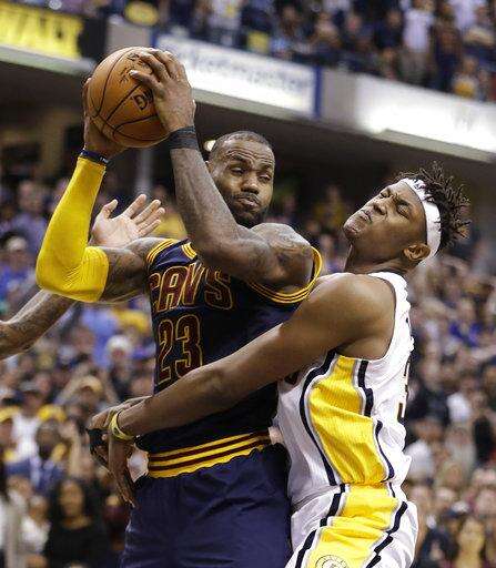 Cleveland Cavaliers' LeBron James grabs a rebound from Indiana Pacers' Myles Turner during the second half in Game 4 of a first-round NBA basketball playoff series, Sunday, April 23, 2017, in Indianapolis. Cleveland defeated Indiana 106-102 and won the series 4-0. (AP Photo/Darron Cummings) The Associated Press