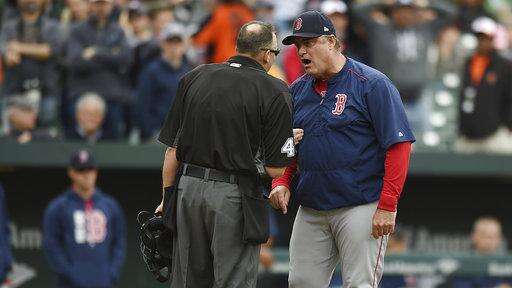 Boston Red Sox manager John Farrell, right, argues with home plate umpire Andy Fletcher after Red Sox pitcher Matt Barnes was ejected after throwing at Baltimore Orioles Manny Machado during the eighth inning of a baseball game, Sunday, April 23, 2017 in Baltimore. The Red Sox won 6-2. (AP Photo/Gail Burton)