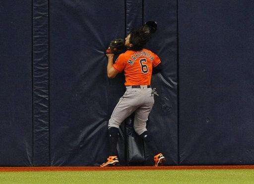 Houston Astros center fielder Jake Marisnick hits the wall after catching a fly ball to the warning track hit by Tampa Bay Rays' Logan Morrison during the first inning of a baseball game Sunday, April 23, 2017, in St. Petersburg, Fla. (AP Photo/Steve Nesius)