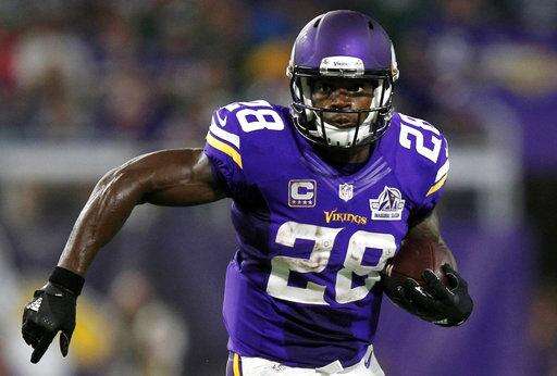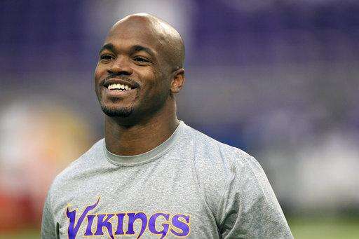 FILE - In this Dec. 18, 2016, file photo, Minnesota Vikings running back Adrian Peterson warms up before the start of an NFL football game against the Indianapolis Colts, in Minneapolis. Free-agent running back Adrian Peterson has reportedly agreed to a two-year contract with the New Orleans Saints. The Saints have not announced a deal, but Peterson tells ESPN in a statement that he's agreed to play in New Orleans. (AP Photo/Andy Clayton-King, File) The Associated Press