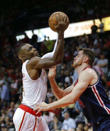Atlanta Hawks forward Paul Millsap, left, shoots as Washington Wizards forward Jason Smith (14) defends in the first half of Game 6 of a first-round NBA playoff basketball series Friday, April 28, 2017, in Atlanta. (AP Photo/John Bazemore) The Associated Press