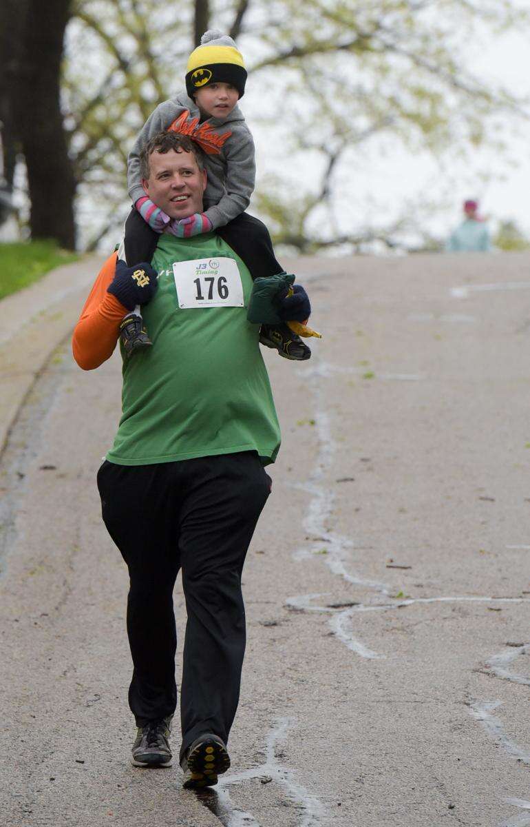 Dan Murphy carries his son Braydan, 4, on his shoulders Sunday for part of the 19th annual Run Thru the Hills races in Lake in the Hills. Mark Black/mblack@dailyherald.com