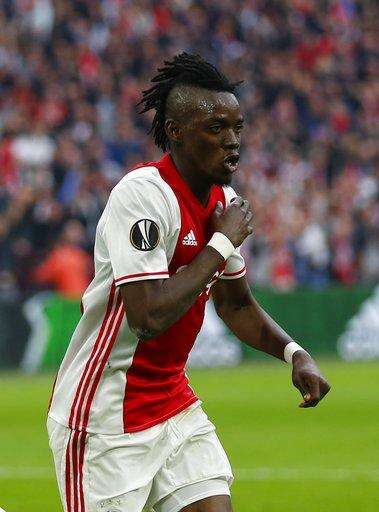Ajax's Bertrand Traore (9) celebrates after scoring the fourth goal of his team during the first leg semi final soccer match between Ajax and Olympique Lyon in the Amsterdam ArenA stadium, Netherlands, Wednesday, May 3, 2017. (AP Photo/Peter Dejong) The Associated Press