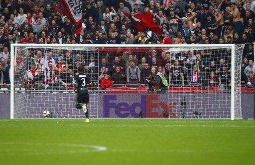 Ajax's Kasper Dolberg (25) scores the second goal of his team as Lyon's Nicolas Nkoulou looks the ball during the first leg semi final soccer match between Ajax and Olympique Lyon in the Amsterdam ArenA stadium, Netherlands, Wednesday, May 3, 2017. (AP Photo/Peter Dejong) The Associated Press