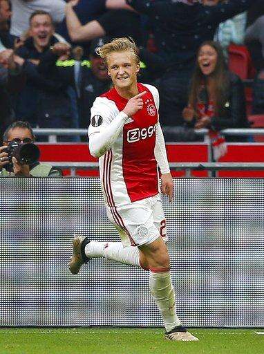 Ajax's Kasper Dolberg celebrates after scoring the second of his team during the first leg semi final soccer match between Ajax and Olympique Lyon in the Amsterdam ArenA stadium, Netherlands, Wednesday, May 3, 2017. (AP Photo/Peter Dejong) The Associated Press