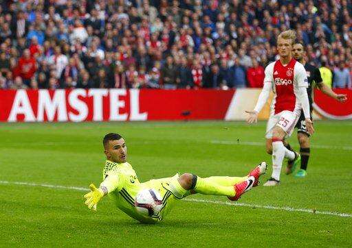 Ajax's Amin Younes scores the third goal of his team as Lyon's goalkeeper Anthony Lopes tries to stop the ball during the first leg semi final soccer match between Ajax and Olympique Lyon in the Amsterdam ArenA stadium, Netherlands, Wednesday, May 3, 2017. (AP Photo/Peter Dejong) The Associated Press