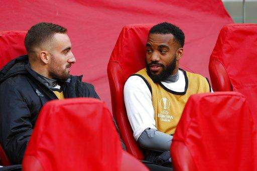 Lyon's Alexandre Lacazette, right, sits on the bench of his team during the first leg semi final soccer match between Ajax and Olympique Lyon in the Amsterdam ArenA stadium, Netherlands, Wednesday, May 3, 2017. (AP Photo/Peter Dejong) The Associated Press