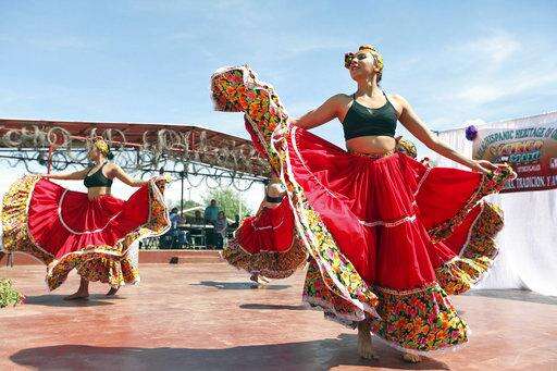 FILE - In this May 5, 2016, file photo, Minerva Allende, right, dances with her fellow dancers of Cuerpo Escena Comania de Danza from the Institute of Chihuahua in celebration of Cinco de Mayo at the LULAC/Hispanic Heritage of Odessa's annual Fiesta Lunch at the La Margarita Festival Grounds in Odessa, Texas. Trump's immigration policies and rhetoric are leaving some Mexican Americans and immigrants feeling at odds with a day they already thought was appropriated by beer and liquor companies, event promoters and local bars. (Jacob Ford/Odessa American via AP) The Associated Press