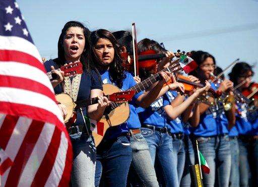 FILE--In this May 3, 2014, file p goto, members of the Ector Junior High Mariachi Band perform while riding on a float during the Cinco de Mayo parade on Crane Avenue in Odessa, Texas. Trump's immigration policies and rhetoric are leaving some Mexican Americans and immigrants feeling at odds with a day they already thought was appropriated by beer and liquor companies, event promoters and local bars. (Edyta Blaszczyk/Odessa American via AP, file) The Associated Press