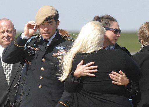 Family members embrace as a military honor guard carries home the body of U.S. Army Sgt. Joshua P. Rodger at Central Illinois Regional Airport on Friday, May 5, 2017, in Bloomington, Ill. Rodgers was killed during a raid on an Islamic State compound April 27, 2017, in eastern Afghanistan. A celebration of life will be held for Rodgers this weekend. (David Proeber/The Pantagraph via AP)/The Pantagraph via AP)