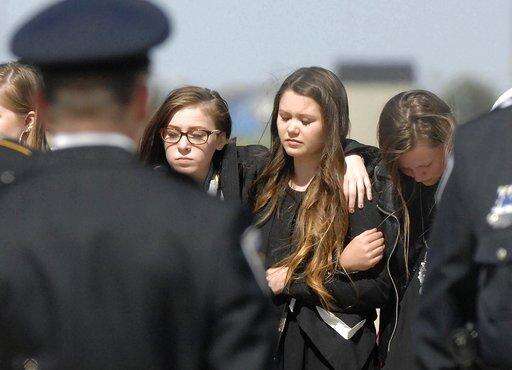 Family members embrace as a military honor guard carries home the body of U.S. Army Sgt. Joshua P. Rodger at Central Illinois Regional Airport on Friday, May 5, 2017, in Bloomington, Ill. Rodgers was killed during a raid on an Islamic State compound April 27, 2017, in eastern Afghanistan. A celebration of life will be held for Rodgers this weekend. (David Proeber/The Pantagraph via AP)