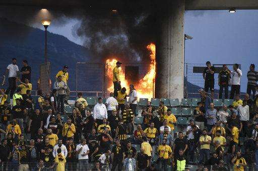 Soccer fans clash with policemen at a tribune of Panthessaliko stadium, ahead of the Greek Cup soccer final between AEK Athens' and PAOK in Volos, central Greece, on Saturday, May 6, 2017. (AP Photo/Giannis Papanikos)