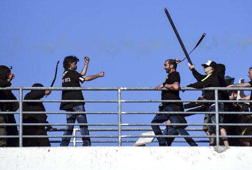 Soccer fans clash at a tribune of Panthessaliko stadium, ahead of the Greek Cup soccer final between AEK Athens and PAOK in Volos, central Greece, on Saturday, May 6, 2017. (AP Photo/Giannis Papanikos)
