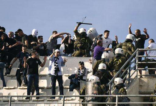 Policemen clash with soccer fans at a tribune of Panthessaliko stadium, ahead of the Greek Cup soccer final between AEK Athens' and PAOK in Volos, central Greece, on Saturday, May 6, 2017. (AP Photo/Giannis Papanikos)