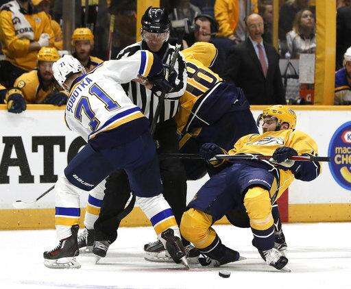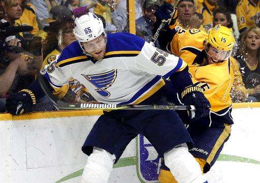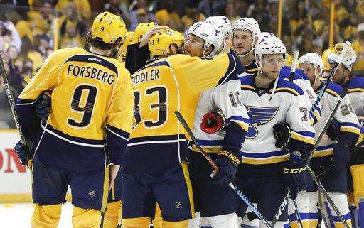Notes: The Predators' only playoff series clinched outside of Nashville came in Game 7 in Anaheim to clinch their first-round series last year. ... The Blues scored first for a third straight game. ... Rinne has three assists this postseason. ... Former Vice President Al Gore, a native Tennessean, tweeted "Stand with us" supporting the Predators after the game.