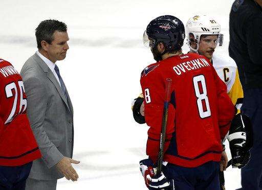 Pittsburgh Penguins coach Mike Sullivan, left, waits to greet Washington Capitals left wing Alex Ovechkin (8), from Russia, who is talking with Penguins center Sidney Crosby (87) after Game 7 in an NHL hockey Stanley Cup Eastern Conference semifinal, Wednesday, May 10, 2017, in Washington. The Penguins won 2-0. (AP Photo/Alex Brandon) The Associated Press