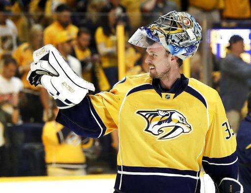 Nashville Predators goalie Pekka Rinne, of Finland, waves to fans as he leaves the ice after his team defeated the St. Louis Blues in Game 6 of a second-round NHL hockey playoff series Sunday, May 7, 2017, in Nashville, Tenn. (AP Photo/Mark Humphrey) The Associated Press