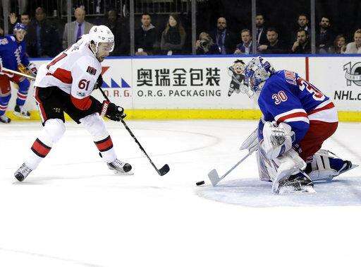 New York Rangers' Henrik Lundqvist (30), of Sweden, stops a shot on the goal by Ottawa Senators' Mark Stone during the first period of Game 6 of an NHL hockey Stanley Cup second-round playoff series, Tuesday, May 9, 2017, in New York. (AP Photo/Frank Franklin II) The Associated Press
