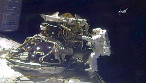 The astronauts wasted no time removing the old electronics box, their No. 1 chore, and plugging in a new unit. The device - a bit unwieldy at more than 5 feet long - supplies electricity and data to science experiments on the outside of the station. The pair also whipped through other tasks, leaving only two undone.