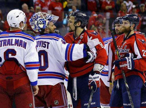 FILE - In this May 13, 2013, file photo, New York Rangers goalie Henrik Lundqvist (30), from Sweden, greets Washington Capitals left wing Alex Ovechkin (8), from Russia, after Game 7 of a first-round NHL hockey Stanley Cup playoff hockey series in Washington. The Rangers won 5-0. The Capitals face the Pittsburgh Penguins in Game 7 of a second-round series Wednesday, May 10. (AP Photo/Alex Brandon, File) The Associated Press