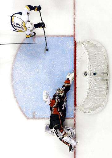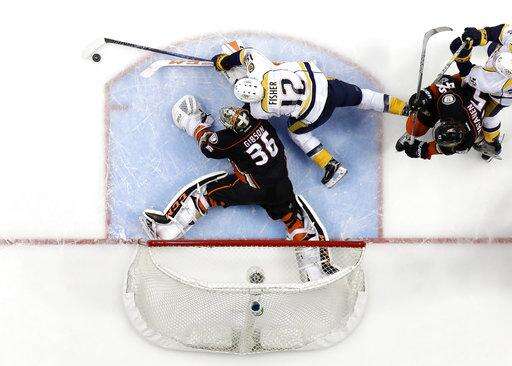 Nashville Predators center Ryan Johansen scores past Anaheim Ducks goalie John Gibson during the first period of Game 2 of the Western Conference final in the NHL hockey Stanley Cup playoffs, Sunday, May 14, 2017, in Anaheim, Calif. (AP Photo/Chris Carlson) The Associated Press