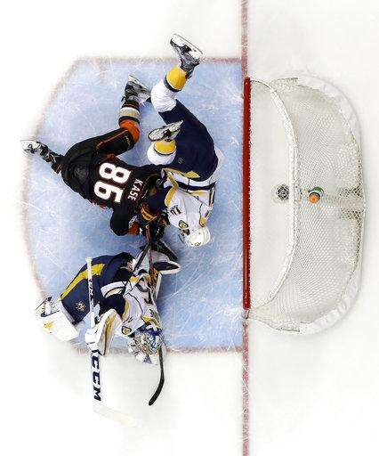 Nashville Predators' Mattias Ekholm (14) collides with Anaheim Ducks' Ondrej Kase (86) as they battle for the puck by the goal during the first period of Game 2 of the Western Conference final in the NHL hockey Stanley Cup playoffs, Sunday, May 14, 2017, in Anaheim, Calif. (AP Photo/Chris Carlson) The Associated Press